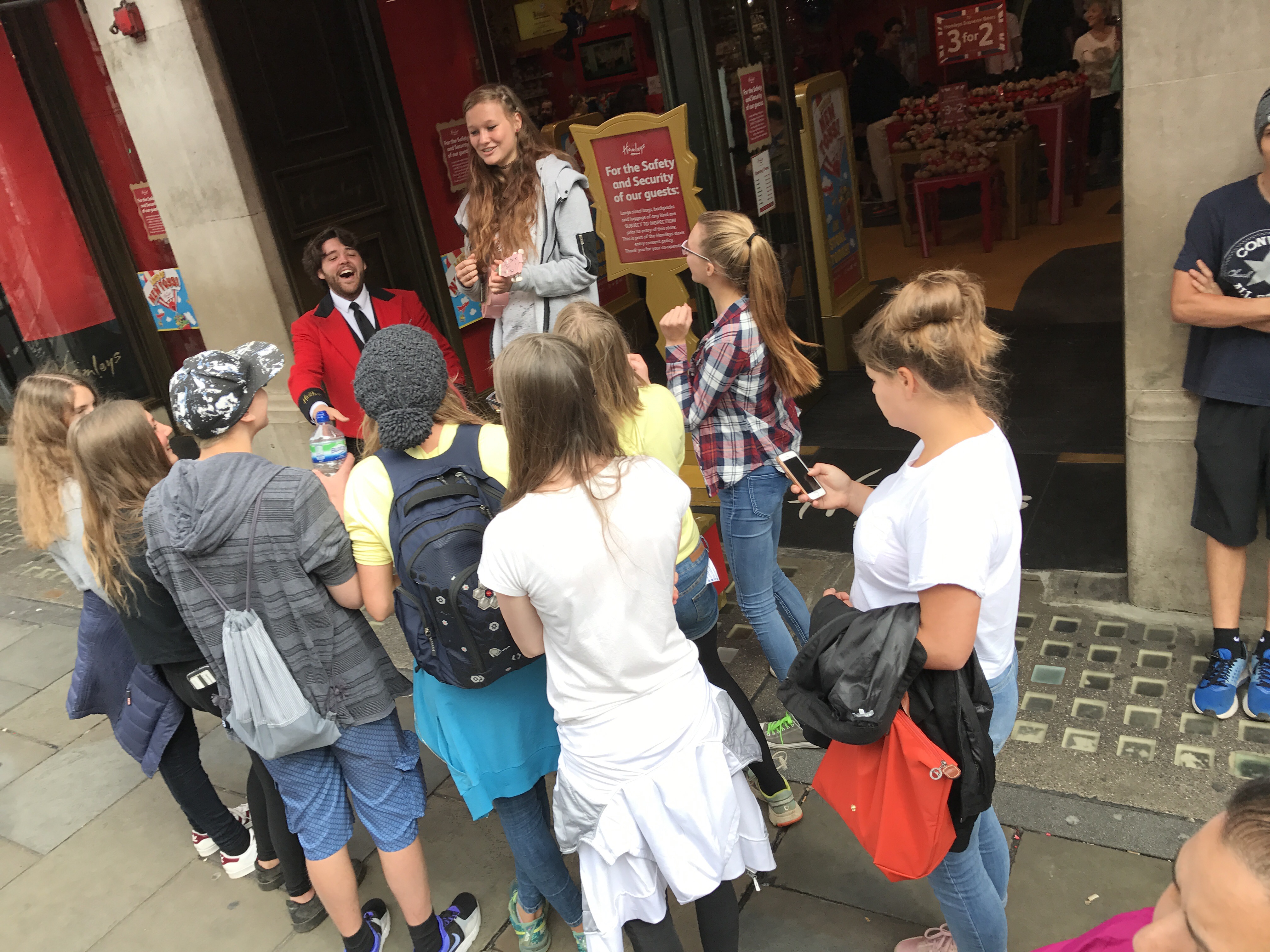 Lina macht Straßenmusik. Die Angestellten vom Hamleys nennen uns „the happy people“