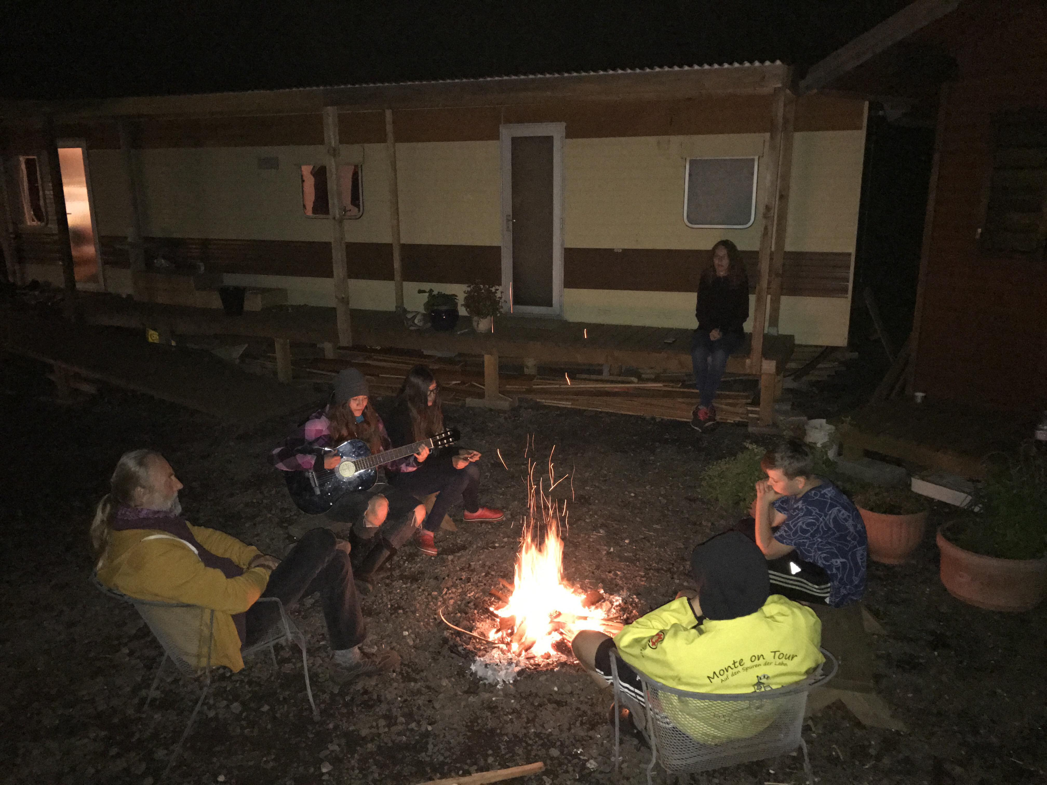 Am Abend dann am Lagerfeuer den Straßenmusikerinnen Kayleigh und Lina lauschen. Sie spielen sich warm für ihren Marktauftritt.