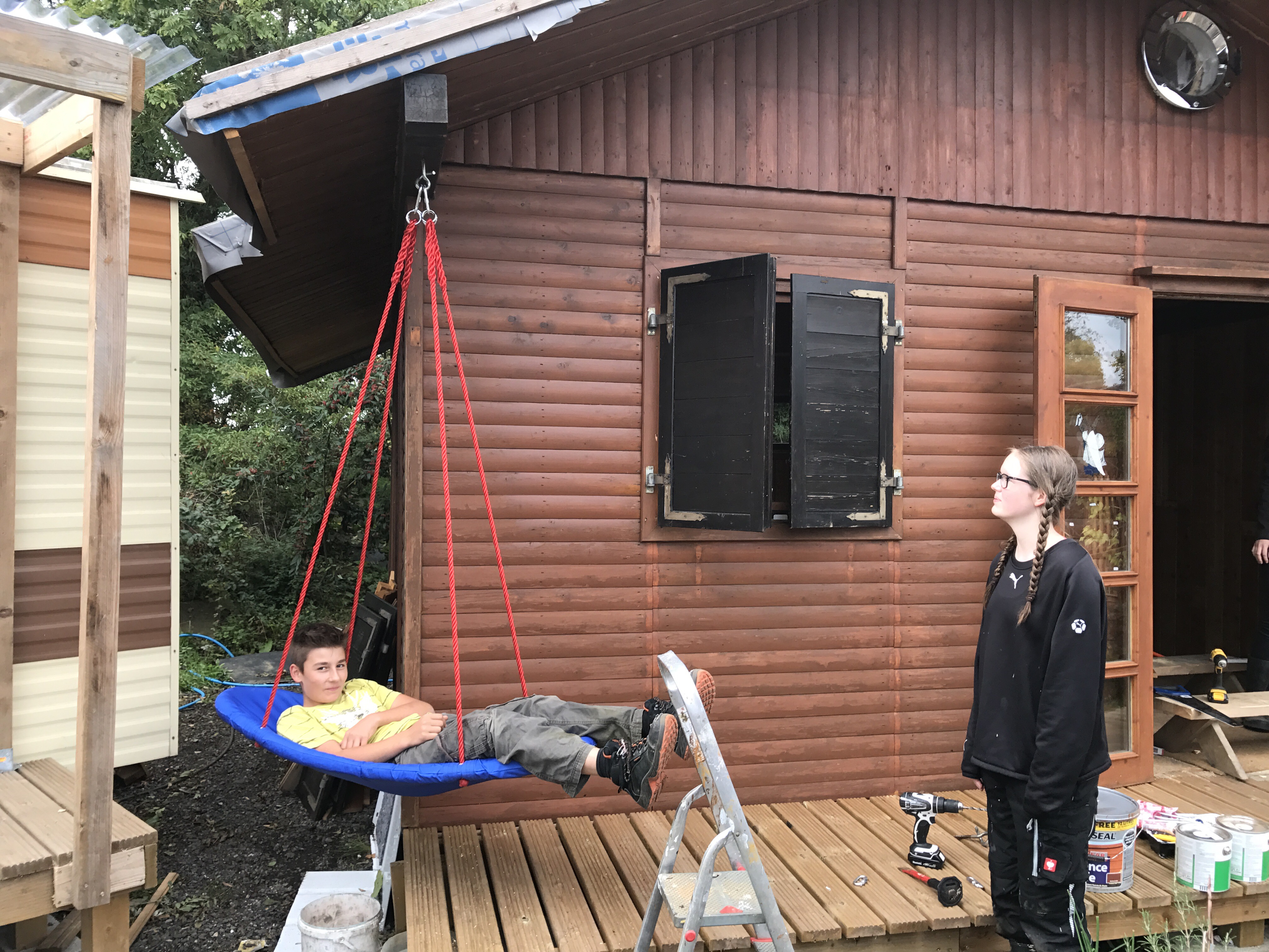 Ist die Schaukel montiert, muss sie auch getestet werden. Tragkraft 100 kg aber wir haben erst einmal mit Miro getestet.