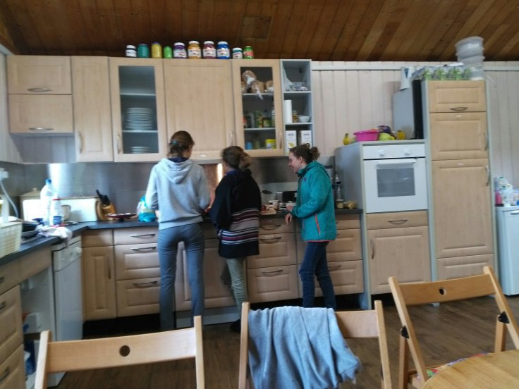 Ida,Sophie und Marie wollten eigentlich das Dach vom Mädchen- Caravan fertig bauen, dass hat aber nicht funktioniert, da es geregnet hat und es dadurch zu rutschig war.