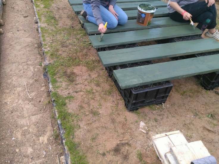 Die Gartengruppe hat das Unkraut in dem Tunnel gerupft, und Bretter für den Kompost angestrichen.