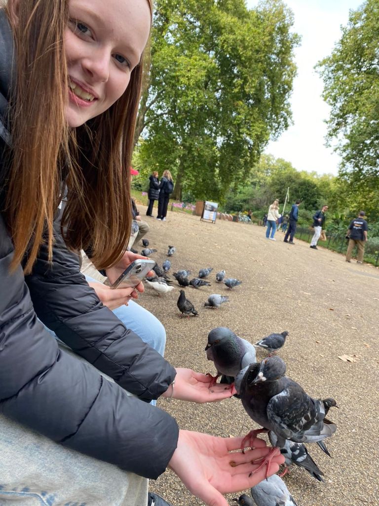 He placed a cup over the spider and a another man came with a paper and brought the spider out of the room. We made cool pictures in the backdrops. In the next room were LED balls on the ceiling and on the wall were mirrors. In the last room there was another photo backdrop, that was a circle in which you stood. When you pulled on a rope and there was a soap balm around you. At the end Anna got another sprite, while Saskia phoned Kevin, sitting outside in a big bubble. Afterwards we went to the tube station to take the tube to the City of London. Zoé didn’t take good care of her things, that’s why Saskia stole her cell phone (Anne’s too – added by Saskia). In London we met the others at Piccadilly Circus. Then we looked for an ATM and walked around for a long time to find it, but we couldn’t find one, so we had to go back to the tube station. Everyone got 10 pounds to buy some food. We then divided ourselves into three groups. One of the groups had lunch at Pizza Hut, another group went to a Chinese shop, while my group were at Five Guys. Melina ordered her first time a lunch by herself in English. After that we went to the M&M shop but didn’t buy anything. Then we went back to the meeting point, where Kevin and the other boys were already sitting and talking. On the side of the square were four break dancers who were dancing. I and Sarah moved a little closer to watch them. The other group also joined us later. Almost everyone wanted to go home, but then we went on a sightseeing tour and Zoé wanted petting squirrels, so we walked through the park and saw also swans and pelicans. Zoé and I then sat on a bench to lie to the pigeons. Melina and I went to pet the squirrels. Afterwards we walked back to the tube station where I stole Zoé’s wallet. (Lenz did the same a few minutes before in the Park – added by Kevin). The tube was very full.Then we missed our stop and had to walk to a new one. When we arrived at the train station it was very full again. When we got back to Northampton everyone was very tired and wanted to sleep. In the evening we ate cake and played Happy Little Dinosaurs.